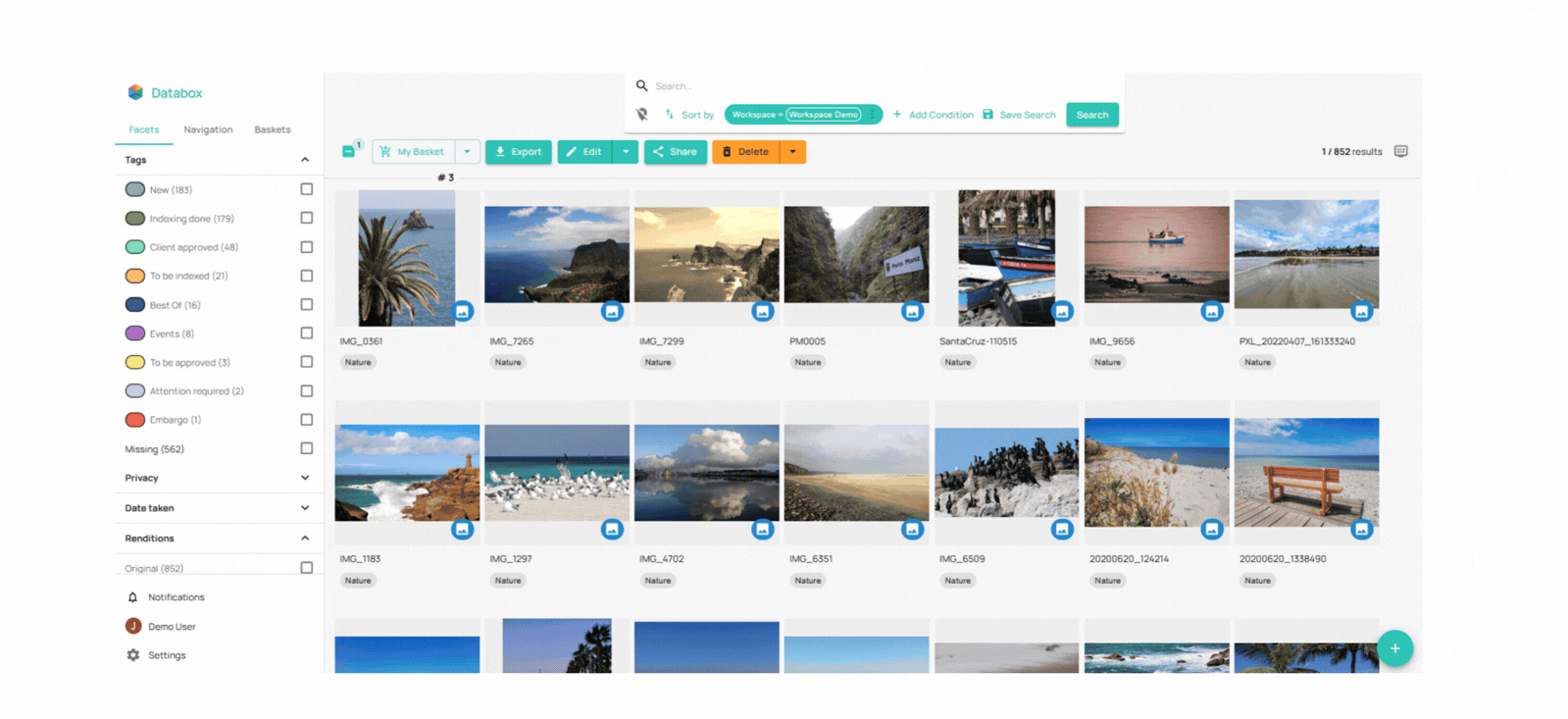 L'interface principale du DAM se nomme Databox. Elle permet d’exploiter toutes les fonctionnalités comme l’ajout, l’indexation, le déplacement, le partage des assets,...